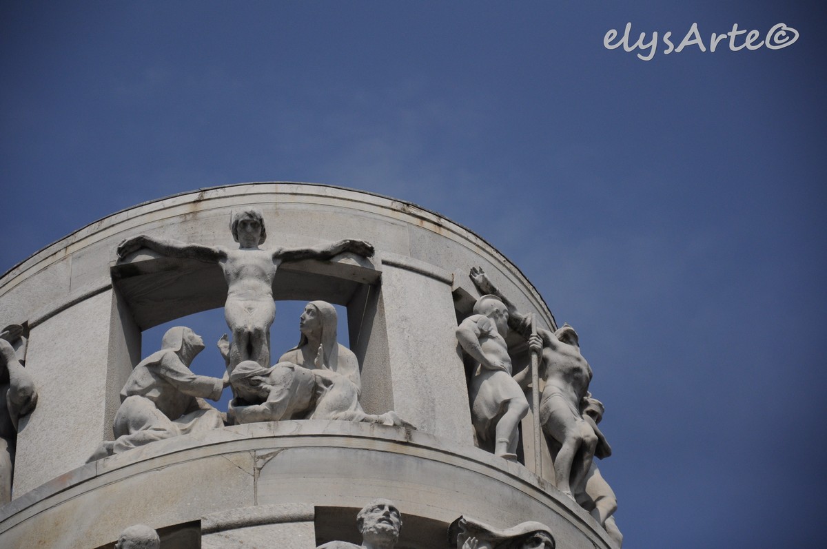 Superato l’Ossario Centrale si presenta davanti ai nostri occhi l’edicola della Famiglia Bernocchi, un tronco di cono che subito mi ricorda la colonna di Traiano a Roma per il suo variegato stuolo di figure che si snodano, come una pergamena, sul corpo conico.
