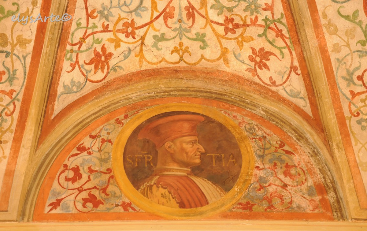 Gli Atellani erano una famiglia devotissima agli Sforza, dinastia cui restarono fedeli sempre e per la quale, nel corso delle guerre d’Italia del primo Cinquecento, svolsero diversi incarichi diplomatici. Il segno di questa devozione è senz’altro la Sala dei ritratti, la sala al pianterreno della casa dove sono dipinti, sotto una volta a lunette completamente affrescata con arabeschi e motivi vegetali, quattordici tondi con le fattezze di altrettanti uomini e donne della dinastia sforzesca. Per identificarli, è necessario decifrare l’iscrizione che accompagna ogni ritratto.