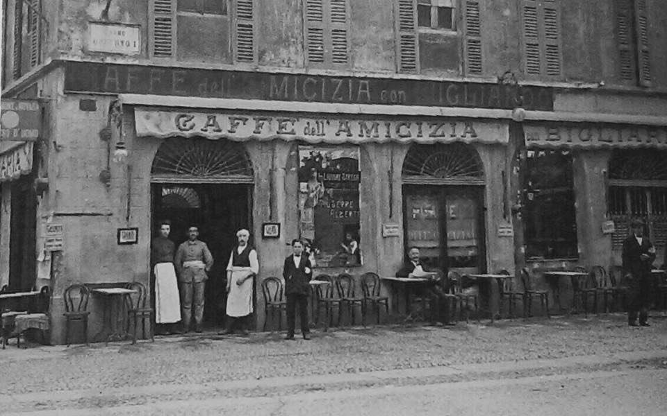 La storia di Campari comincia in un caffè di Novara, il Caffè dell’Amicizia, che ai tempi si trovava all’angolo delle Ore, un locale che Gaspare Campari aveva acquistato nel 1860 dopo aver lavorato in due luoghi storici di Torino e avervi appreso l’arte del liquorista. A Novara, Gaspare crea i suoi primi prodotti di distilleria, che si chiamano “Elisir di lunga vita”, “Olio di Rhum”, “Liquore Rosa”. Ma gli affari non vanno bene. Gaspare si trasferisce a Milano, dove apre un piccolo negozio di liquori sotto il Coperto dei Figini e, in vista della sua demolizione, prenota una bottega nella Galleria in costruzione. Sceglie il negozio d’angolo, sulla destra entrando in Galleria, segnando così l’inizio della storia del Campari. A gestire il locale è la moglie Letizia, mentre lui si dedica a perfezionare i prodotti delle sue distillazioni: nascono così il “Fernet Campari” e il famosissimo “Bitter”, l’aperitivo che in un primo tempo viene servito esclusivamente ai clienti del caffè.
