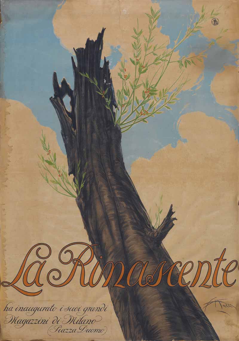 La Rinascente riapre i battenti. Il celebre manifesto realizzato da Aldo Mazza per la riapertura dei magazzini, in cui è raffigurato un tronco di ulivo da cui sbocciano nuovi rami, è un rimando al concetto simbolico della rinascita.