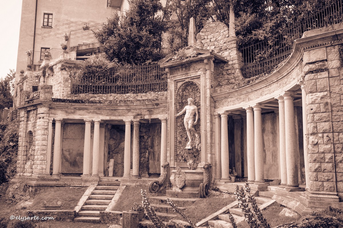 C’è quel gusto eclettico, quell’alone magico che subito mi elettrizza. Una teoria di statue, telamoni, capitelli bizantini incastonati in un bel giardino all’italiana dove si può ammirare anche uno splendido fiore: l’acanto. Fu la passione che l’artista aveva per l’antico a volere l’acanto nel suo giardino.