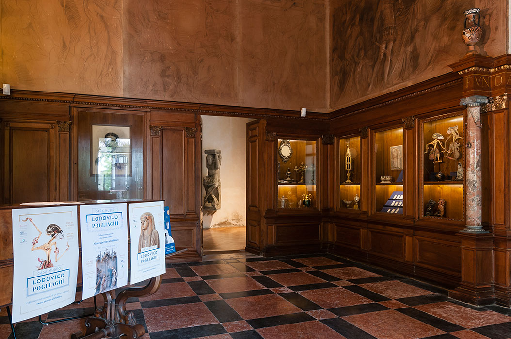 La sala d’ingresso è detta Sala della Madonna o Sala delle Collezioni (fotografia dal sito www.casamuseopogliaghi.it) per via dell’intenzione di Pogliaghi di esporvi i pezzi più preziosi e rappresentativi della sua collezione. L’allestimento, la scelta dei pezzi, la decorazione pittorica e le stesse vetrine sono state concepite e realizzate da Pogliaghi stesso. La selezione degli oggetti esposti può essere considerata una sorta di campionario non solo delle passioni collezionistiche dell’eclettico artista, ma anche della storia dell’arte e dell’archeologia in generale. Sono infatti presentate opere dei più diversi materiali (terracotta, oro, argento, avorio, porcellana, carta, tessuto prezioso…) e provenienti dai più diversificati contesti storici, artistici e geografici. Tra i pezzi più significativi si segnalano un Cristo in croce dello scultore fiammingo Giambologna, una Madonna col bambino tedesca in legno policromo datata all’inizio del Cinquecento, vetri delle manifatture medicee e veneziane, statue e oggetti votivi orientali.