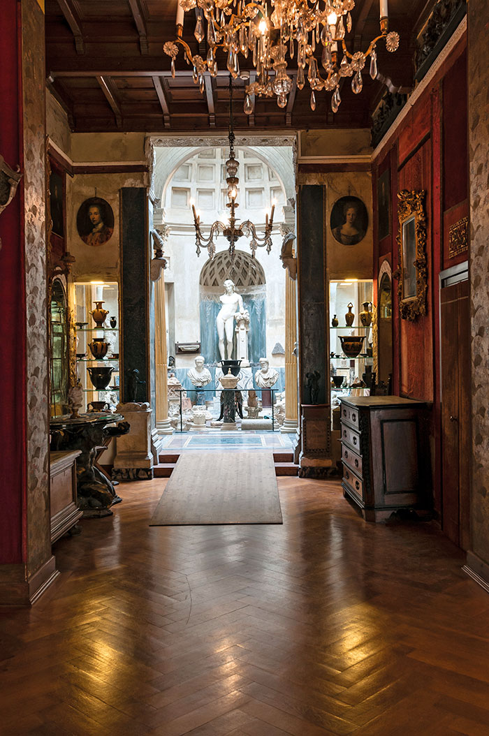 Adoro il soffitto e le pareti lignee mischiate alle collezioni antiche, impastate con le decorazioni che testimoniano il modus operandi dell’artista.