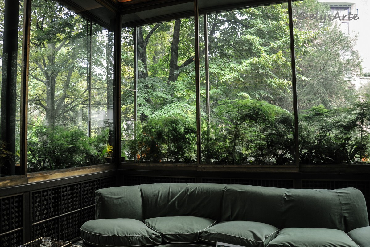 Il dettaglio più affascinante è la vetrata: sfruttando la doppia vetrata Portaluppi crea una serra lungo le pareti della stanza, tendendo l’ambiente elegante e avvolto dalla luce e dai colori della natura circostante.